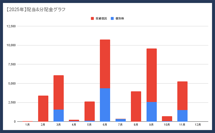 2025年に受け取った配当金と分配金の合計は、43,069(11/29現在)になりました。
